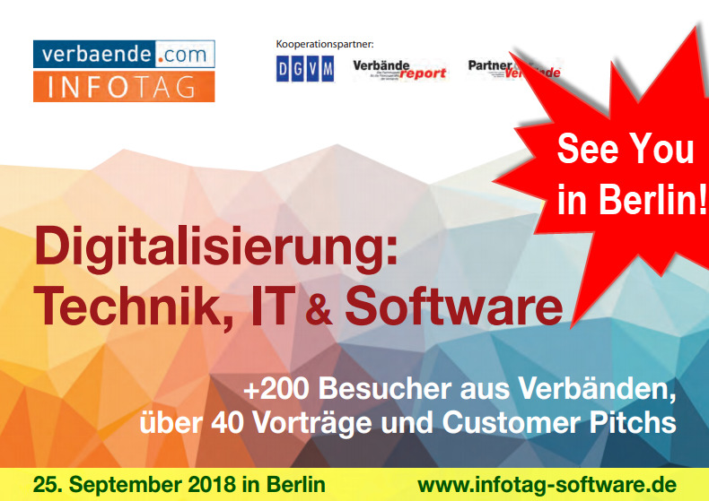 Der verbaende.com Infotag findet am 25. September 2018 in Berlin statt. Der Themenschwerpunkt der Fachmesse ist: „Software & IT für Verbände“. SEWOBE, der Premiumanbieter für online-Mitgliederv...