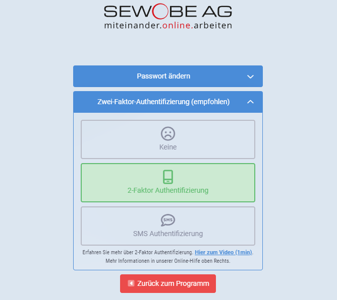 Ihre Benutzer müssen zunächst die App „Google Authenticator“ auf ihrem Smartphone installieren. Dann kann ein Benutzer im Profil-Menü oben rechts in der Hauptmaske unter dem Punkt „2FA einstellen“ den Zwei-Faktor-Login aktivieren.