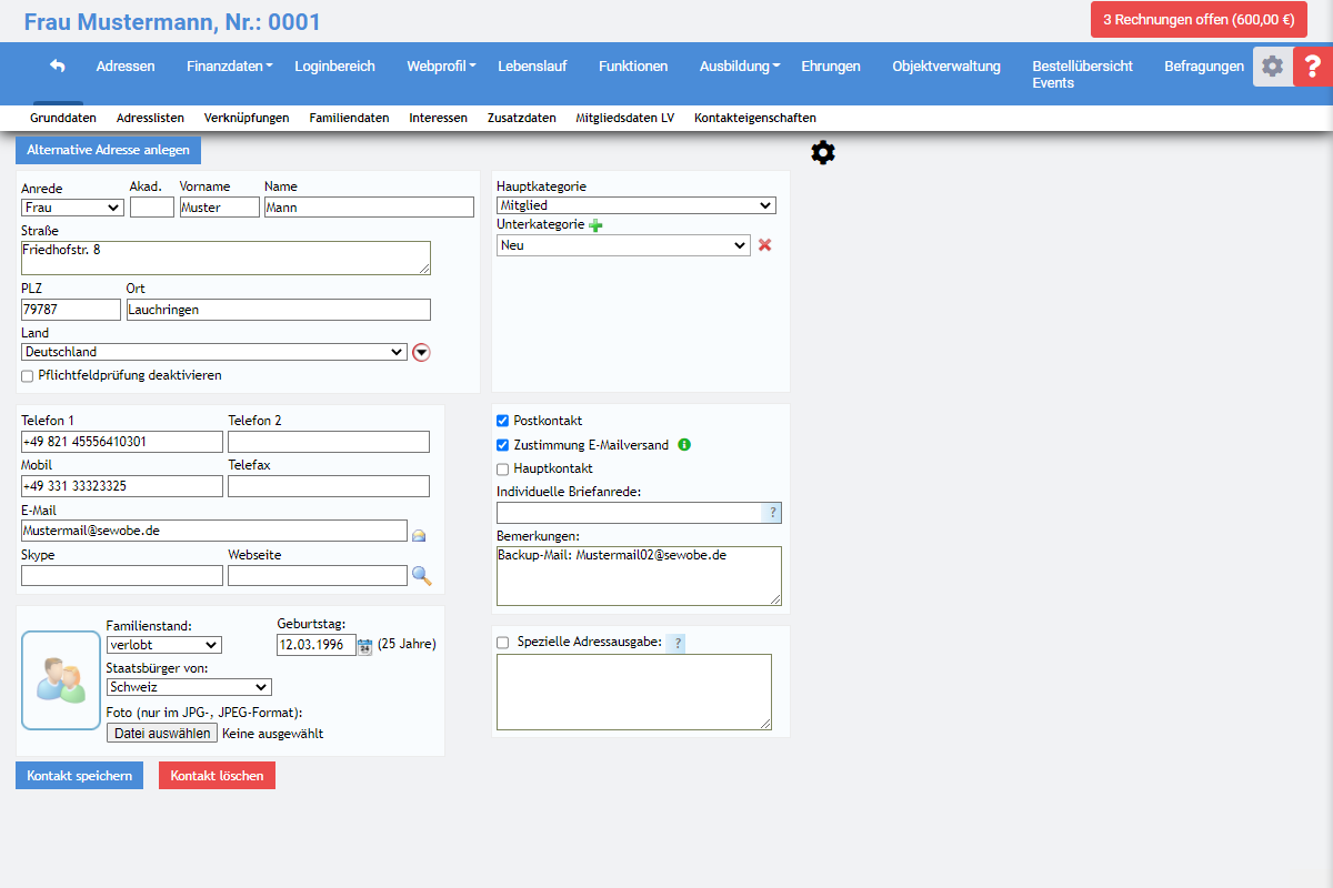 Nicht nur der Import, sondern auch das Neuanlegen von Adressen, ist mit der Mitgliederverwaltung unserer Software zur Verbandsverwaltung ein Kinderspiel. Folglich Sponsoren, Mitglieder, Privat- oder Geschäftsadressen, mehrere Wohnsitze – das alles wird übersichtlich gespeichert.Mitgliederrelevante Informationen, die optimale Vorgänge und bestmögliche Kommunikation garantieren, werden direkt beim Kontakt gespeichert. Verschiedene Haupt- und Unterkategorien (z.B. Mitglied, Sponsor, Interessent) garantieren, dass Sie immer die richtigen Kontakte für Ihr Anliegen finden: Sei es für eine Veranstaltungseinladung oder für einen Serienbrief.