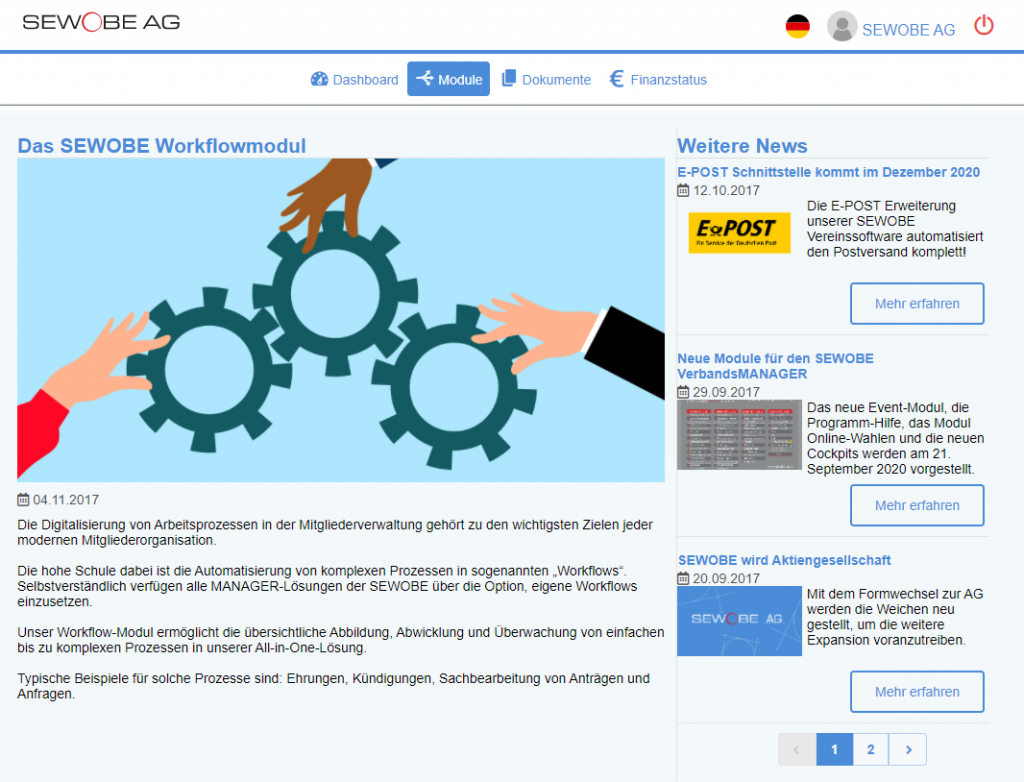 Sie können viele wiederkehrende Prozesse mit dem Workflow Modul abbilden. Das Modul hilft Ihnen die Workflows zu planen, verwalten und zu überwachen. Das Modul arbeitet hierbei als Toolbox für Ihre Workflows. Da das Workflow Tool mit anderen Modulen verknüpft ist, können Sie diese innerhalb ihres Workflows zusammenarbeiten lassen. Somit wird nicht immer eine neue Programmierung benötigt. Dadurch entsteht mehr Ordnung und die Prozesse werden übersichtlicher. Die Zusammenarbeit der Module führt dazu, dass Ihre Mitglieder/Mitarbeiter keine Aufgabe übersehen und Sie die Arbeit im Team optimieren. Sie können von einer manuellen Aktion eines Anwender, wie ein Formular bearbeiten, in einer individuellen Maske zeigen und generieren lassen. Ebenso die Stufen bearbeiten, in welchen bestimmte Felder als Pflichtfelder oder read-only felder definierbar sind.