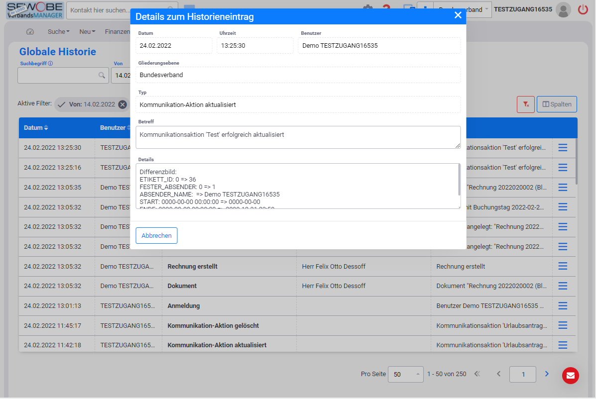 In der Historie unserer Verwaltungssoftware haben Sie einen Überblick über alle Arbeiten und können diese so nachvollziehen. Einerseits gibt es die globale Historie. Diese bezieht sich auf alle Aktivitäten Ihrer Verwaltungssoftware. Andererseits lässt sich exakt feststellen von wem welche Arbeiten durchgeführt wurden. Des Weiteren gibt es neben der globalen Historie, die Kontaktbezogene Historie, die nur alle Änderungen an einem ausgewählten Kontakt anzeigt.