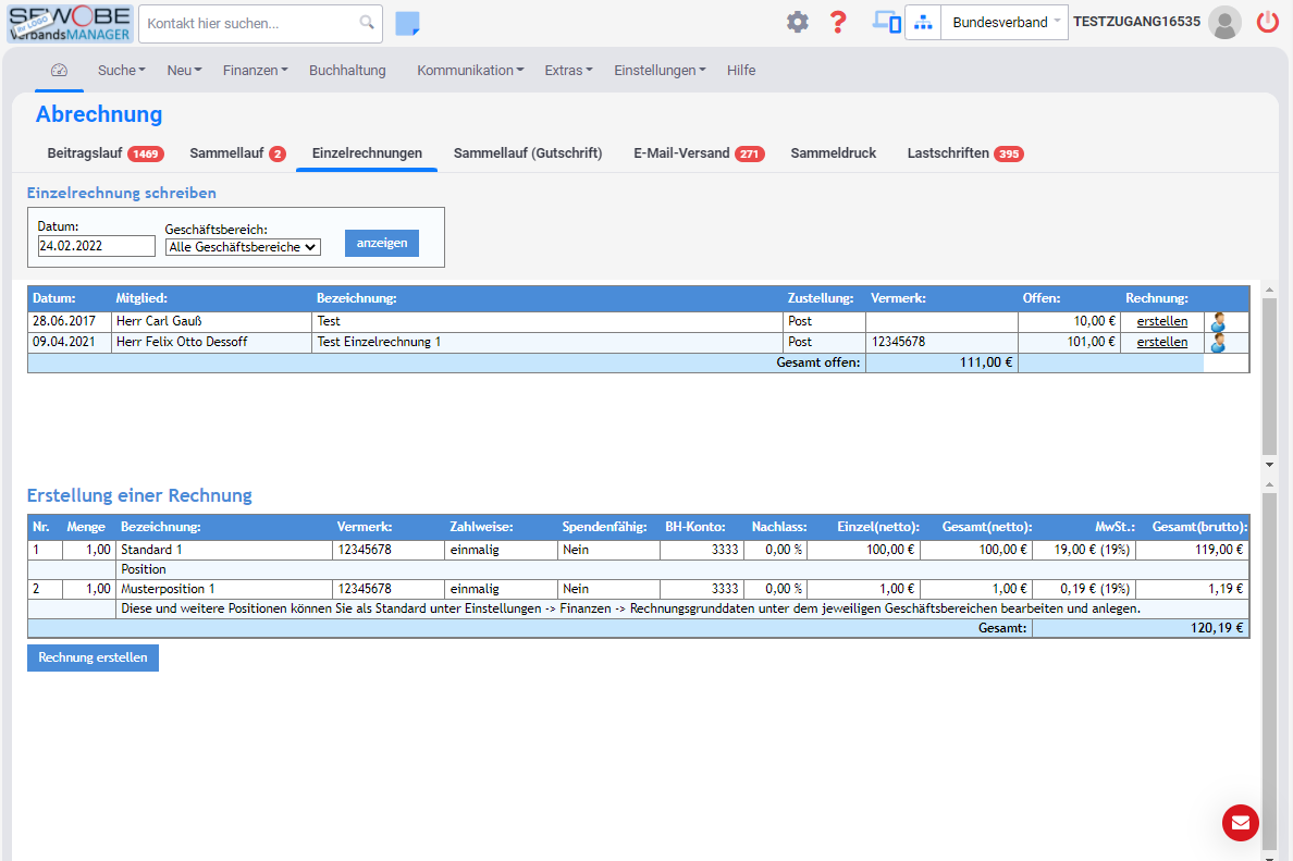 Mit dem integriertem Angebotsmodul können Sie ebenso Angebote mit freien Texten und Beträgen erstellen. Das bedeutet Sie müssen nicht nur feststehende Beiträge verwenden. Bei Einzelrechnung ist es dadurch möglich freie Texte und Beträge zu erstellen, statt festen Rechnungen zu verwenden. Zu den frei erstellbaren Angeboten für, zum Beispiel, freie Dienstleistungen, können Sie auch daraufhin freie Aufträge erstellen. Wären diese Kostenpflichtig, ist es auch noch möglich zu diesen Aufträgen, Rechnungen zu erstellen. Paar Beispiele für diese Anwendung wären die Abrechnung von Arbeitsstunden oder auch die Abrechnung von Produkten.